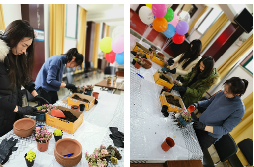 女職工們擼起袖子,帶上手套,跟著園藝師從灌裝填土、多肉種植、面層鋪石到灑水定型,一步步完成多肉植物DIY制作,并將其帶回辦公室。每一個多肉盆栽“成品”形態各異,蠢萌可愛。
