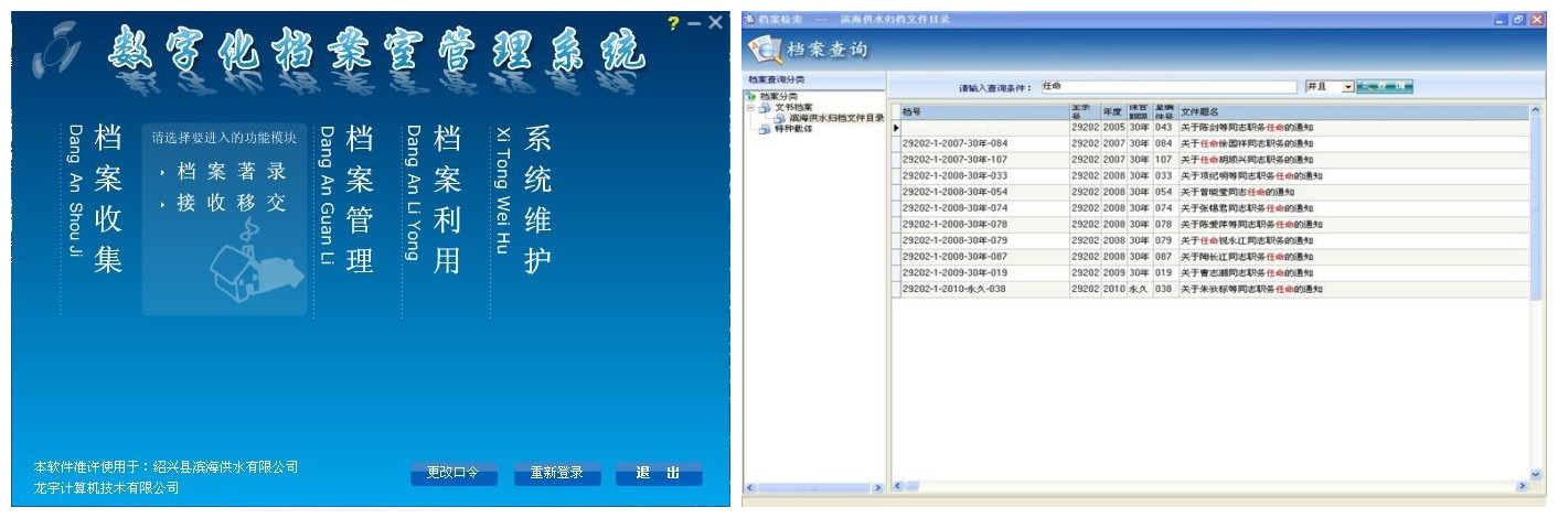今年年初以來,在縣檔案局指導(dǎo)下,濱海供水公司檔案工作有了較大提高,數(shù)字檔案室建設(shè)基礎(chǔ)良好,軟、硬件條件完善,達(dá)到檔案信息數(shù)字化標(biāo)準(zhǔn)。目前,檔案室建有文書、會(huì)計(jì)、用戶、工程、人事、設(shè)備、聲像等7大類電子檔案數(shù)據(jù)庫及供水管網(wǎng)信息、綜合水供水信息、小舜江供水信息、綜合水用戶信息、大事記、組織機(jī)構(gòu)沿革等6個(gè)專題數(shù)據(jù)庫,歸檔電子文件達(dá)20995件。同時(shí),開通電子檔案信息查詢平臺(tái),并與辦公自動(dòng)化系統(tǒng)實(shí)現(xiàn)聯(lián)通,可隨時(shí)訪問利用電子檔案信息,進(jìn)一步提升了供水信息化程度,提高了檔案服務(wù)能力。