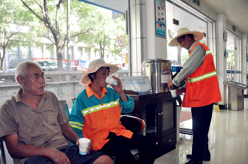 今年6月以來,供水公司積極響應浙江之聲廣播電臺發起的“一杯水”大型公益活動,在全區13個供水營業大廳設置了免費供水點,并配備了醫藥箱,為高溫下的環衛工人、交警、路政、快遞員等一線勞動者提供一處納涼地。公司已連續三年開展該活動,目前已累計提供9000多次服務。圖為三位老人正在城區供水營業廳飲用茶水。