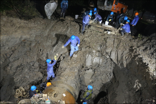 1月17日晚,紹興柯橋濱海供水公司搶修人員在寒夜中冒雨搶修DN1000一期原水管。據了解,該管線位于興濱路與越北路交叉口以南,是公司輸送原水的重要管線,公司根據工業區供水情況,在不影響企業用水的前提下展開搶修工作,經過開挖、電焊等工序,連續工作12小時后,直至晚上9點原水管搶修完成。